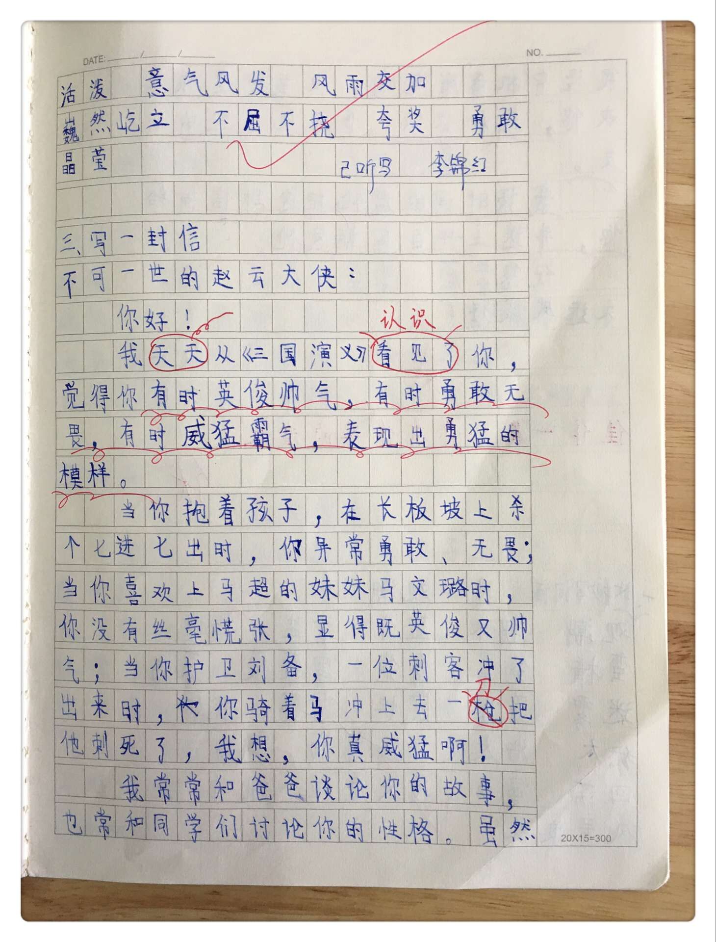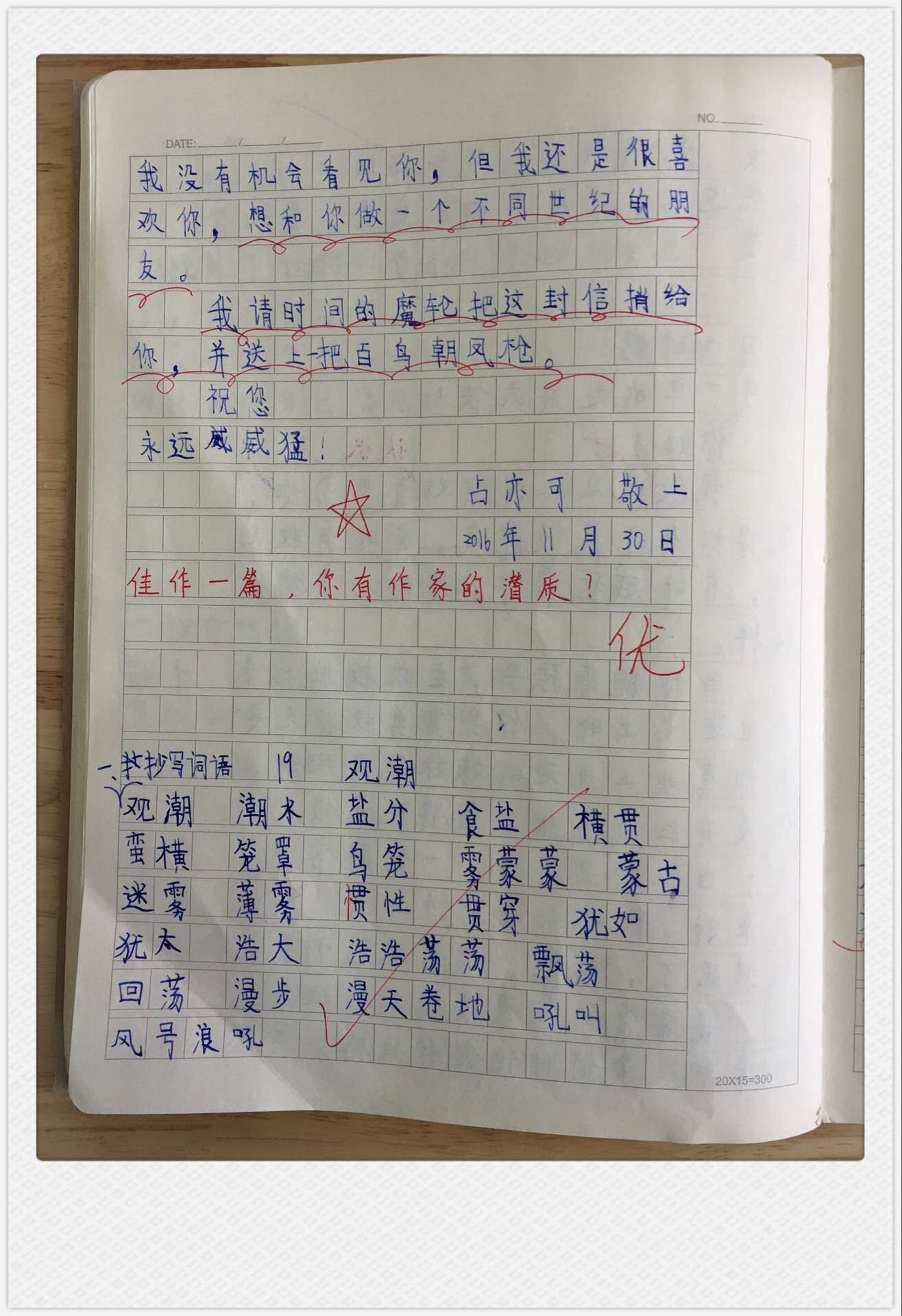 写段是低年级说话、写话的继续,是高年级成篇作文的铺垫。老师应精心设计模仿类的语言训练点,让文中优美的语言形式扎根于学生心田。在教学《山和海的书信》一文时,我们给孩子们留了一份写话作业,“参照文中的排比段,给你心中景仰的‘他’写一封信”。下面我选取其中一篇习作和大家分享一下吧。多么富有童趣的语言,脑洞大开的想象力,类似这样的练笔,可以充分激活学生的思维。学生在建构新知识的同时,加深对文本的理解,并灵活运用新知识,使较复杂的句式得到训练,写作能力得到提高。