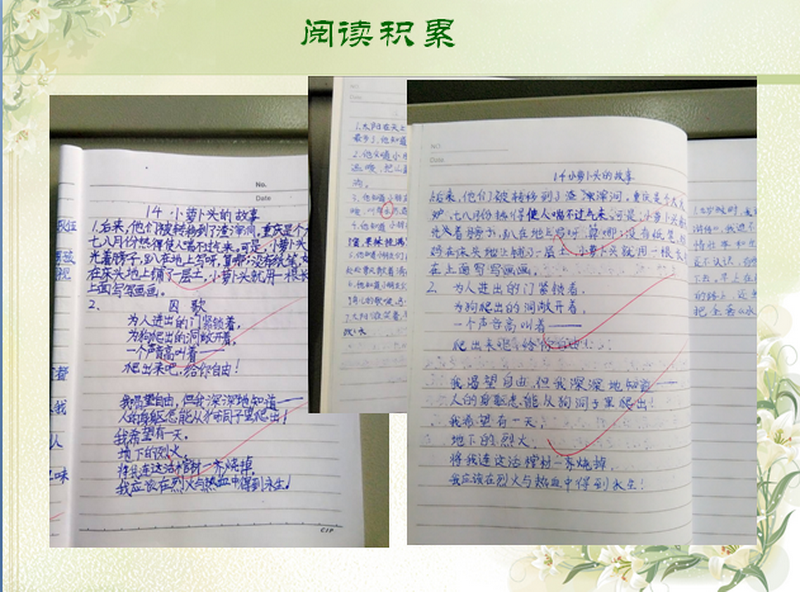 其次是课外学习拓渠道。《语文课程标准》规定了课外阅读总量和背诵篇数,列出了背诵推荐的篇目。我们经常组织学生开展丰富多彩的课外读书活动,并指导学生在读书过程中摘录好词好句,写上自己的体会,同时,要求学生每周背两至三句自己摘录下来的好句子,让学生积累更多的语言,从而提高学生的阅读能力。