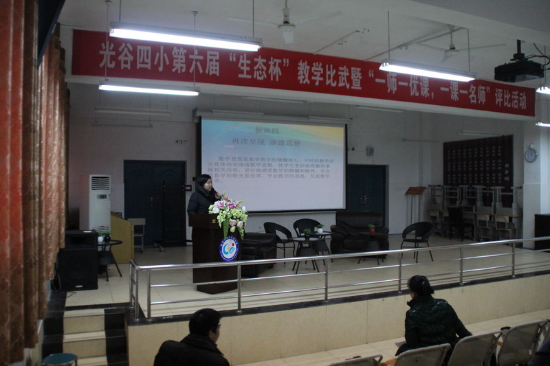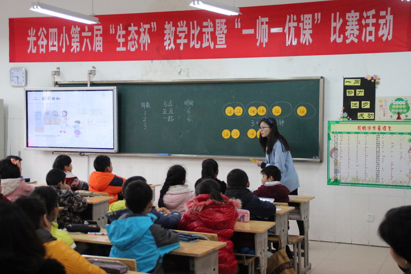 12月18日,武汉市光谷第四小学“一师一优课、一课一名师”活动由数学组率先启动。本次活动旨在推进信息技术与学科整合,促进教师的专业化发展,促进学校教研团队的建设。整个数学组被分为低数、中数、高数3个组进行评比展示,每组的活动由一人上课、另一人说课、教研组全体成员参加研讨展示三个部分组成。3个教研组主要利用信息技术、教育云等优质资源开展课堂教学,将信息技术与数学深度的融合,彰显了学科特色,达到了课堂高效,教师教得轻松,学生学得快乐。本次活动光谷四小特意邀请了开发区高段教研员李文华老师和在我校跟岗培训的6位影子校长担任评委。