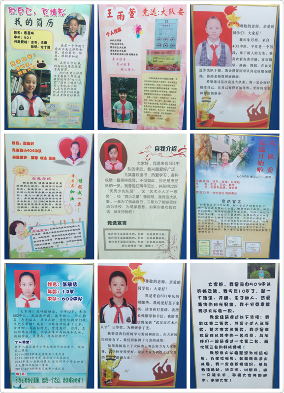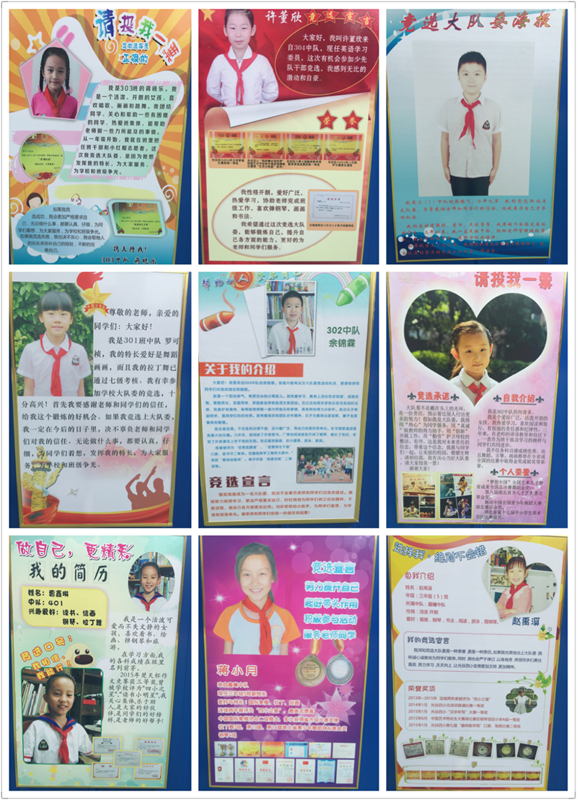 第二阶段,候选队员们为自己完成了一张竞选海报。学校统一张贴宣传,竞选海报张贴以后,每个课间都有队员围在海报前仔细观看,并不时地交流议论,挑选自己心目中理想的大队干部。而这些大队委员候选人为了让队员们对自己有全面的了解,也都精心设计了海报,不仅有自己的简介和竞选宣言,还附上了照片和获得的荣誉,个性彰显。一幅幅精美的海报形成了一道独特亮丽的风景线,把校园点缀得五彩缤纷。