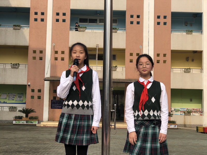 担任本周升旗手的是来自603中队的桑洁羲和刘言两位队员,首先,由他们做简短的升旗手事迹汇报。