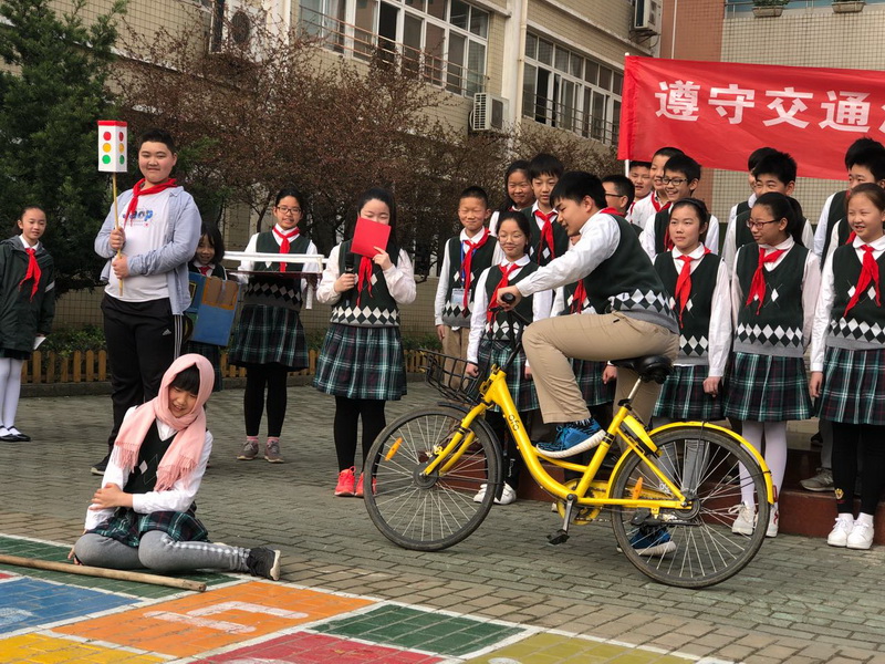 接下来603中队的杨轩睿、廖奕萱、胡可、林雨晨、文愉涵等同学进行了“交通安全常记我心”的情景剧表演。他们呼吁队员:“遵守交通安全,不在马路中间行走,做到红灯停、绿灯行,不足12岁不骑车上街,骑车不带人等”,队员们感受其中,回味思索。
