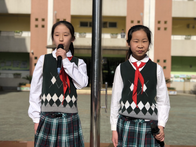 早上8点20分,在全体师生的瞩目下,升旗仪式开始了。首先由501中队升旗手郑铭涵和张乐妍两位队员讲解升旗手事迹,全体师生面向国旗庄严敬礼。