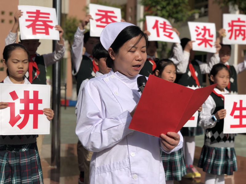 伴随着嘹亮的国歌声,鲜艳的五星红旗冉冉升起,在充满活泼的校园里,两位小主持人覃锦研和陈欣悦进行国旗下演讲,讲解了春季传染性疾病的主要病症。