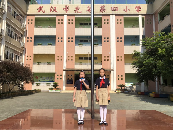 首先由404中队升旗手宋哲莹、李佳凌两位队员进行了自我介绍。在嘹亮的国歌声中,全体师生庄严而肃穆地注视着五星红旗冉冉升起。
