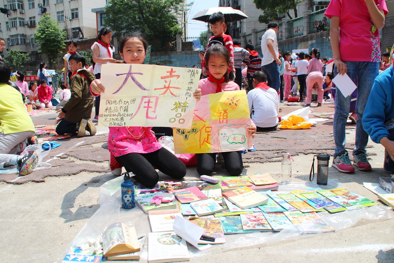 各种新旧图书醒目地展现在大家面前,如同琳琅满目的书市。为了将自己闲置的书籍推荐出去,完成自己的销售目标,同时也是为了筹集更多的资金,尽可能多地换购自己喜爱的书籍,孩子们使出各种招数。由各个班级推选出的总负责人、守摊推销员、记帐员、守在自己班级“书摊”前,各尽所能地吆喝、招揽“顾客”前来购书、换书,朗朗口号声,推荐解说声,讨价还价声不绝于耳,真是热闹非凡。