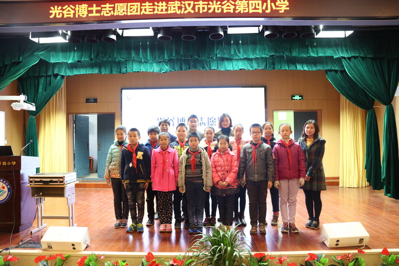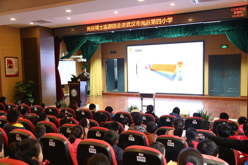 你知道吗?在我们的生活中,有很多各种各样的光,有看得见的,也有看不见的!2016年12月8日下午两点,光谷博士志愿团的博士冯博士走进四小校园,带着四小100多名学生遨游在科技之光中,受邀参加活动的还有来自四小共同体豹澥小学的十几名学生。