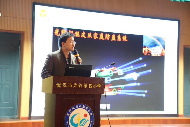冯博士还给孩子们讲了另一种光——光纤,科学家们非常了不起,运用这种光,研究出了一种光纤智能皮肤防盗系统,它有声音识别功能以及人脸识别功能,像人的皮肤一样,还能感知外界发生的意外,能很好的起到防盗作用,最后冯博士还拿出这套系统给孩子们展示了它的防盗技能,孩子们都赞不均口。