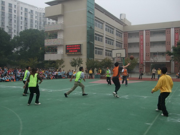本次运动会特为低年级新增了许多有趣的集体项目,如:运送炸弹、火线夺宝、夹球接力等,运动中孩子们释放着热情、感受着健康、飞扬着快乐!他们稚气的表现给所有观众留下了深刻的印象。28日上午进行的教师篮球比赛把本届达标运动会更是推向了新的高潮。校园里到处回荡着学生为老师加油助威的呐喊声,教师运动员们在篮球场上个个摩拳擦掌,生龙活虎,他们的激情使运动会显得更加精彩!