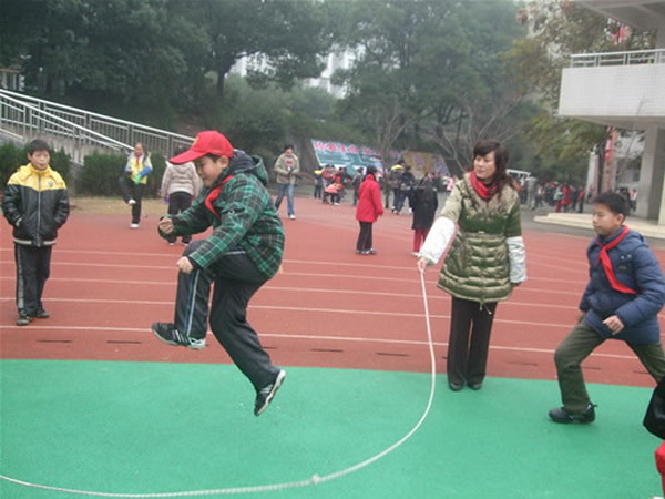 每天上午的“大课间”活动中,各班学生在班主任的带领下,有秩序地在指定场地进行“阳光健康跑”和“三跳运动”; 每天下午二三节课的“阳光活动”时间里, 各班又在指定场地进行乒乓球,跳长短绳,踢毽子,扔沙包,跳皮筋等趣味游戏,丰富多彩的体育活动让寒风料峭中的校园沸腾了。平时严谨的老师和同学们一起参加阳光体育锻炼,俨然回到了那烂漫的少年时光,同学们的眼睛里也闪烁着兴奋的光芒, 操场上欢呼声此起彼伏,快乐的笑声震彻云霄……校园操场成了孩子们尽情游戏和运动的快乐王国!