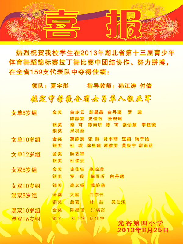 2013年8月22日至24日,第十三届湖北省青少年体育舞蹈锦标赛在华中师范大学佑铭体育馆举行。在为期两天半的比赛中,我校学生积极参加,成绩斐然。荣获各组别的金奖有17人,银奖16人,铜奖5人,其中四年级的张定宇在200多名选手中脱颖而出,荣获全省少儿单人组亚军!
