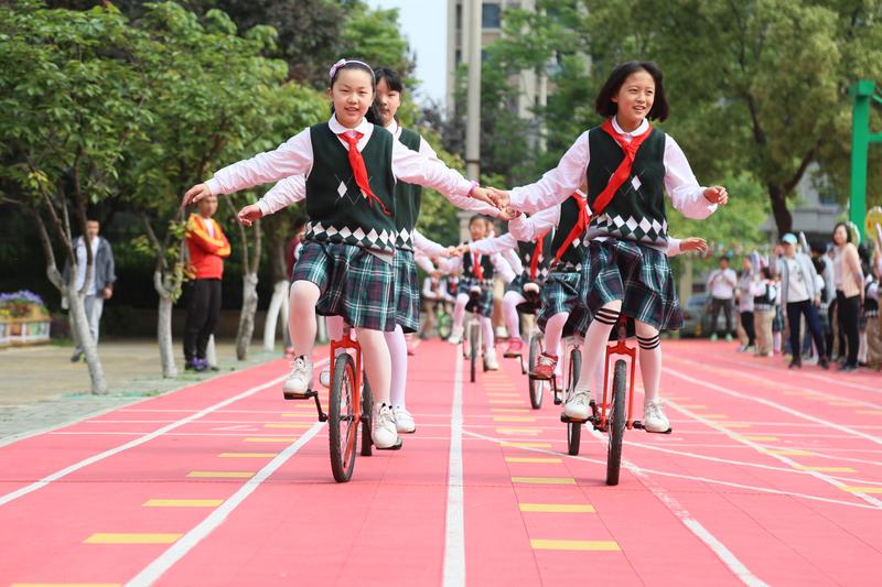 瞧,步伐铿锵的国旗护卫队走在前列,精神抖擞的彩旗队紧随其后,紧接着是神采奕奕的班级代表队,30个班级,30个方阵,那整齐划一的步伐、到位有力的动作、嘹亮激情的口号、别出心裁的展示无不显示出四小学子蓬勃向上的精神面貌。最后闪亮登场的是校特色社团—独轮车社团,同学们一对对手挽手,脚踩独轮车,在环形跑道上风驰电掣,车轮滚滚展活力,欢呼阵阵显激情。