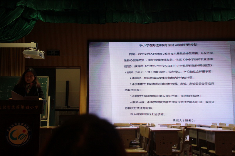 为严格规范办学行为,强化师德师风建设,杜绝暑期乱办班、乱补课现象, 3月25日下午,光谷四小党支部开展了“教师签订《拒绝有偿补课承诺书》”活动。