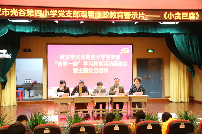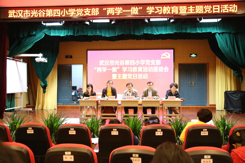 5月27日,武汉市光谷第四小学党支部“两学一做”学习教育活动座谈会暨主题党日活动在多媒体教室举行。支部委员饶家伟同志主持会议,教文体局机关干部进学校联系人蔡家富等同志及学校全体党员参加活动。
