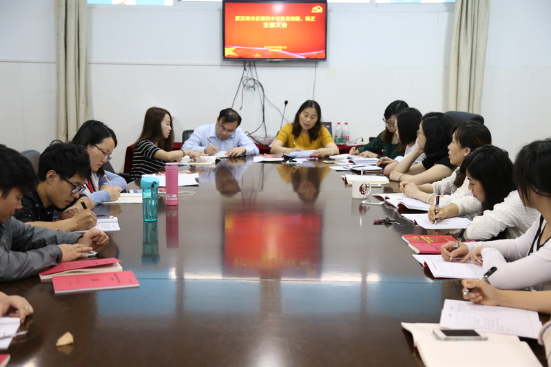 2016年6月28日星期二下午,光谷四小学校党支部在三楼会议室召开了全体党员大会,会议由党支部书记李九胜同志主持,全体党员教师、入党积极分子准时参加。