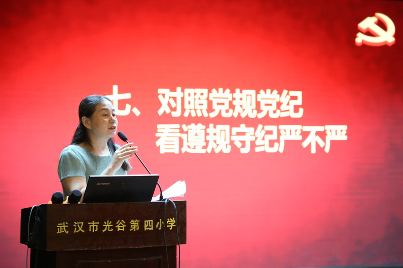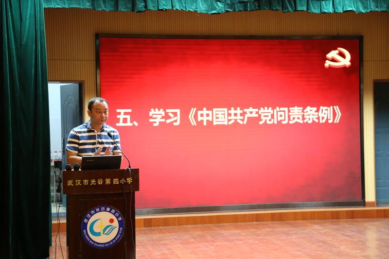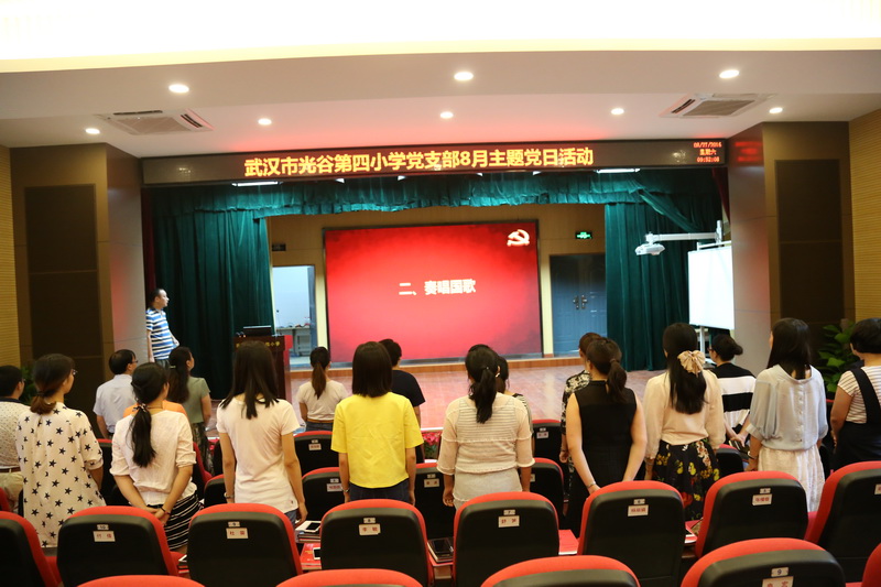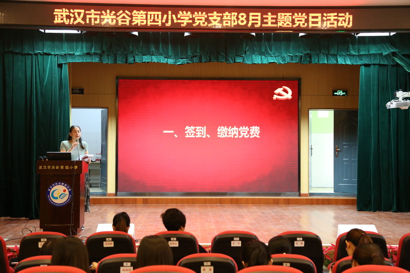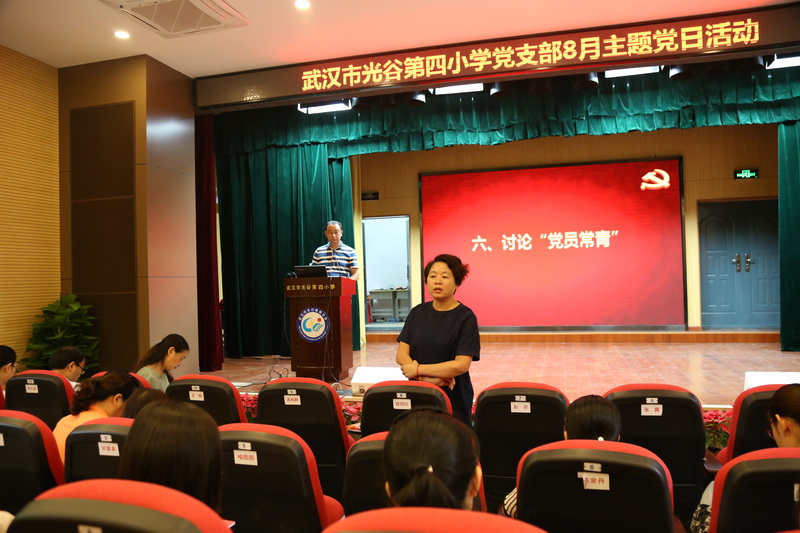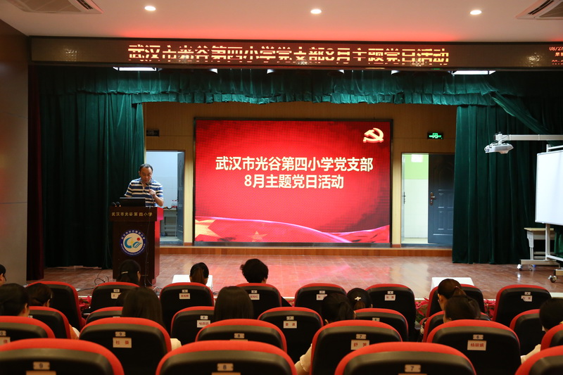 8月27日上午,武汉市光谷第四小学全体党员同志,集中在报告厅开整了八月份“支部主题党日”活动。本月主题党日活动以“坚持不忘初心,践行党员常青”为主题,开展思想整顿,清除思想灰尘,保持纯洁性。