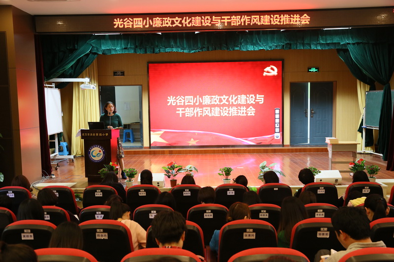 2017年4月14日,光谷四小开展“光谷四小廉政文化建设与干部作风建设推进会”。会上,支部书记李九胜就学生家长反映的问题,家校沟通中的问题,学生干部竞选问题,学生课业负担问题以及教学常规等五大问题通过数个鲜活的例子进行了深入剖析。