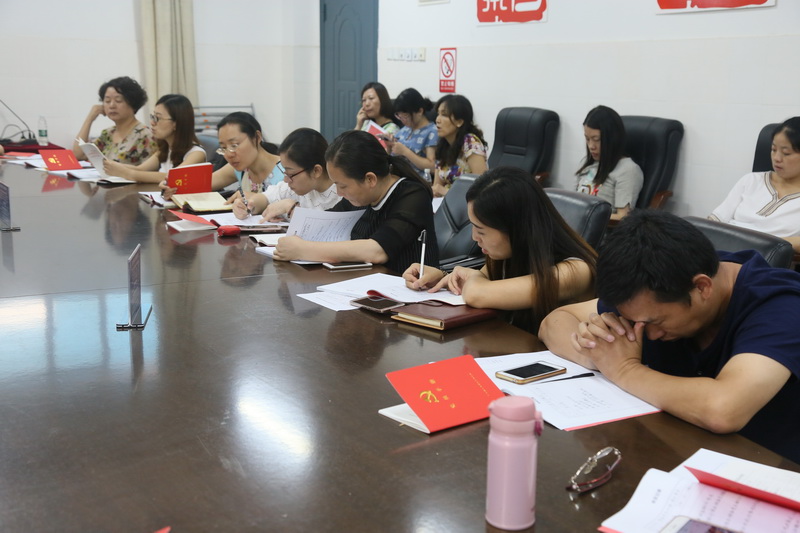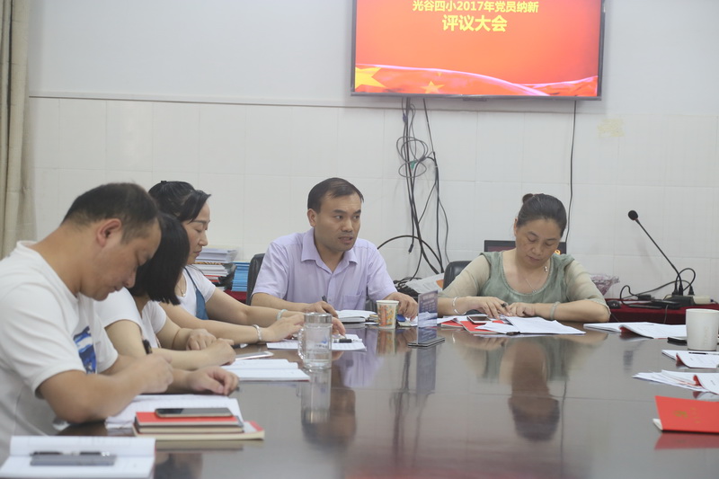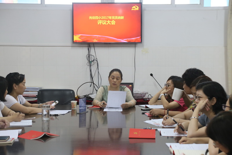 7月10日下午,光谷四小召开2017年党员纳新评议大会,全体党员同志集中在会议室,对我校詹智梅老师加入中国共产党进行党员民主评议。