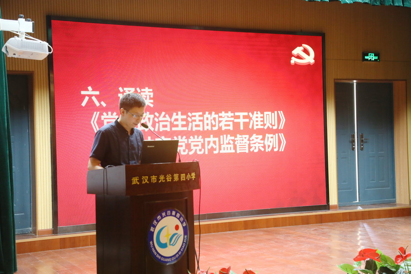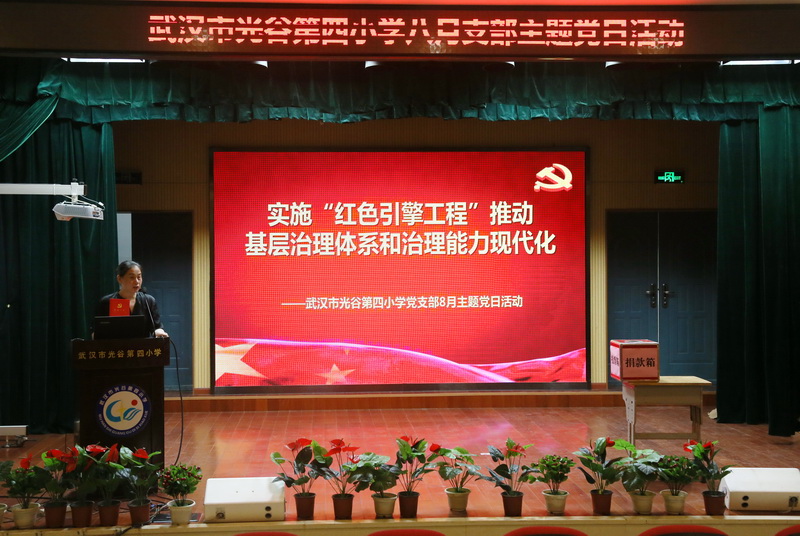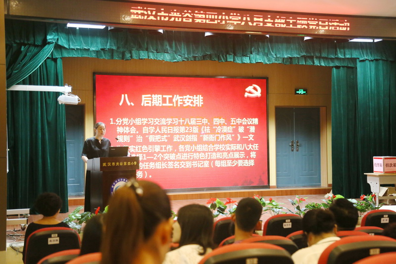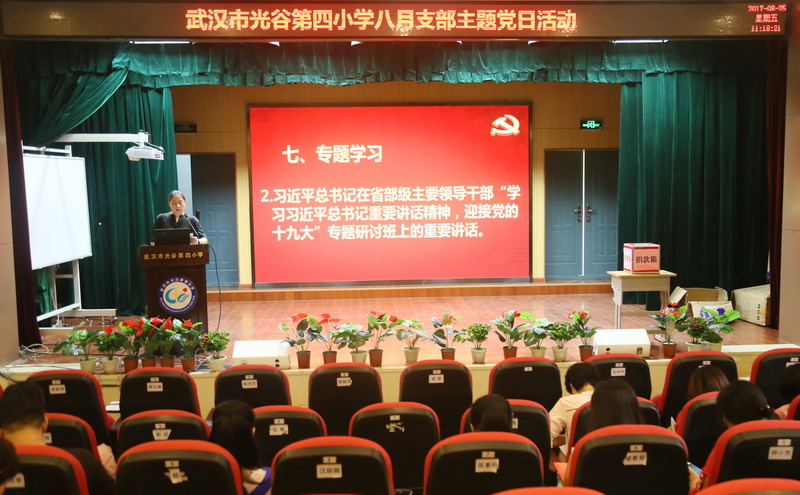 2017年8月25日,光谷四小全体党员集中在报告厅,召开主题为“实施“红色引擎工程”推动基层治理体系和治理能力现代化”的8月份“支部主题党日”活动。