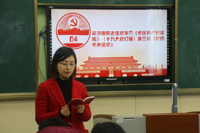会议的第一阶段,党员签到并交纳二月党费。紧接着由支部书记李九胜同志通报党员到会和本月党费缴纳情况,并宣布会议开始。在支委会成员方卫同志的带领下新年重温入党誓词。之后高洪琳同志组织学习《中国共产党章程》(十九大修订版)第三章《党的中央组织》。