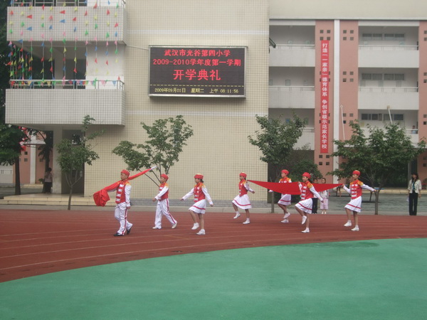 九月一日早上清风送爽,迎着阳光带着欢笑,光谷四小开学典礼在欢快的乐曲声中拉开了序幕。本学期,光谷四小共增加教师6名、迎接新生一百四十多名,沈爱贞校长激情洋溢的开学致辞打开了2009学年的大门,点燃了2009年秋天的梦想;新教师恳切真挚地讲话表达了所有老师的心声;魏忠书记关于提高安全意识的讲话拉回了全体教师和学生放飞了一个暑假的心,增强了师生的安全意识,五(1)班学生表演的“古诗诵读”拉开了光谷四小诗文素养的序幕……。